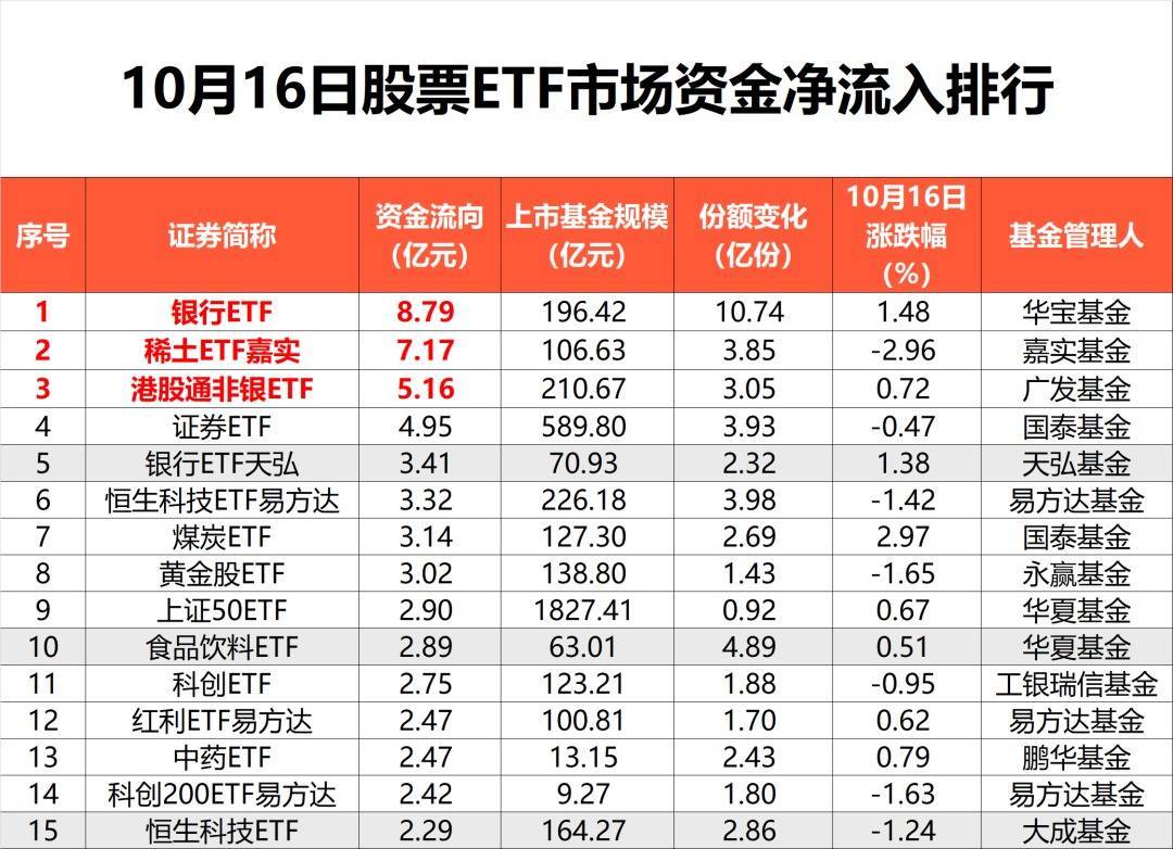 近日科技股“熄火”背景下,银行、券商、煤炭等板块活跃,银行ETF、稀土ETF嘉实、证券ETF等产品净流入居前。
