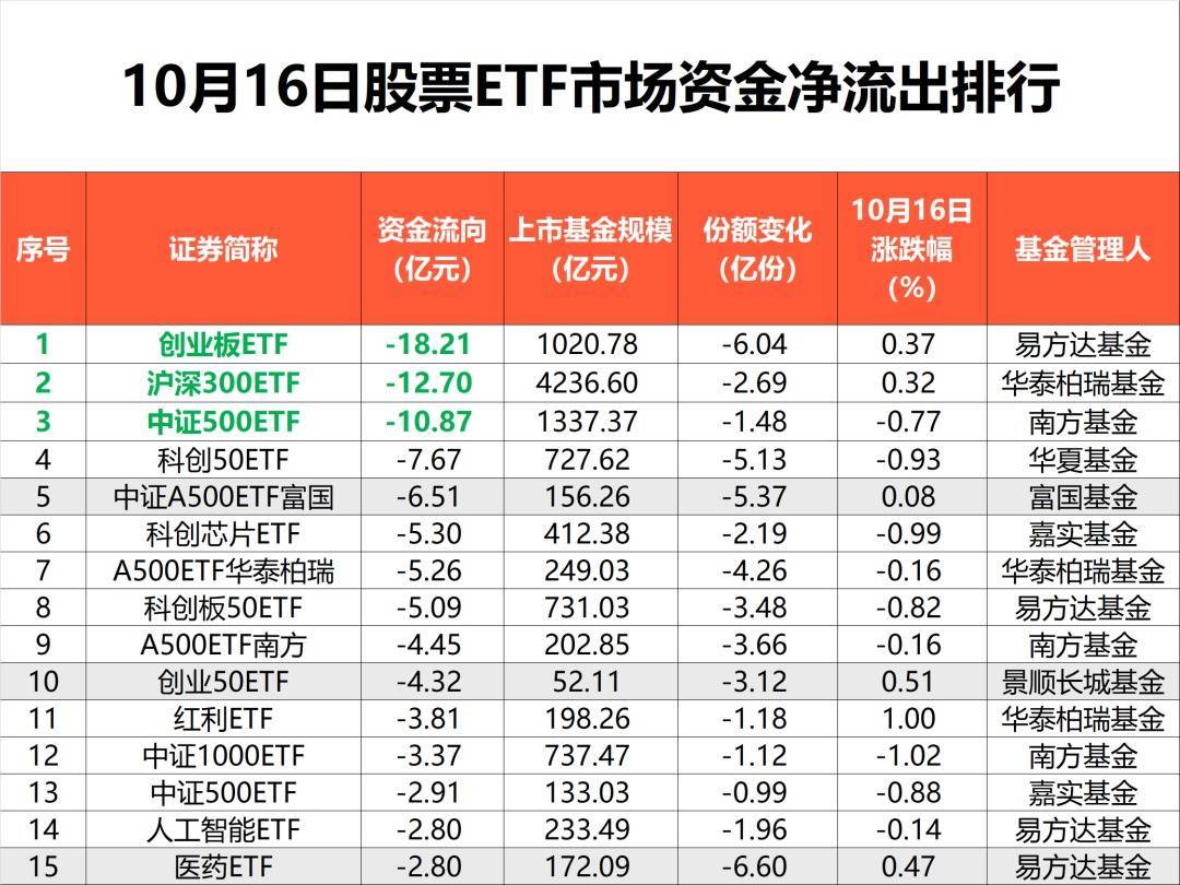 另外,创业板ETF、沪深300ETF、中证500ETF等产品昨日净流出资金均超10亿元,位居市场前三位。